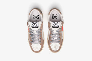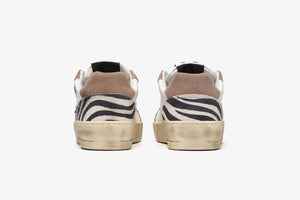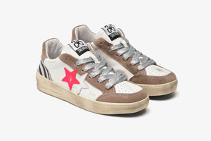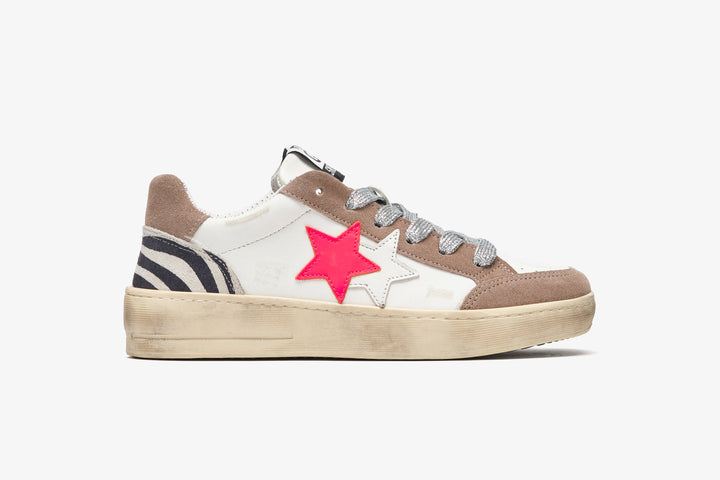 SNEAKER NEW STAR IN PELLE BIANCA CON DETTAGLI CROSTA TAUPE, ZEBRATA E FUCSIA ED EFFETTO "USED "